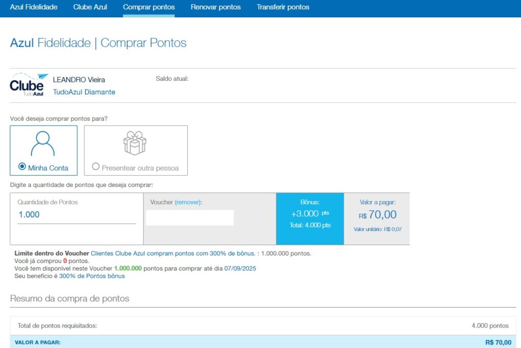 O Programa de fidelidade da Azul se reserva o direito de modificar, suspender ou cancelar este produto, bem como alterar o valor dos pontos Azul ofertados, conforme previsto no Regulamento do Programa de fidelidade da Azul. Importante: É obrigatório que o proprietário do Cartão de Crédito utilizado para compra de pontos Azul seja o mesmo CPF do cliente que receberá os pontos.