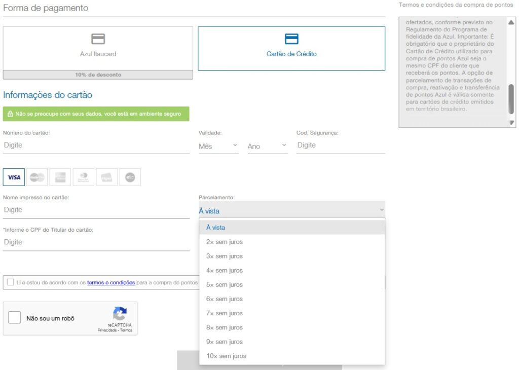 A opção de parcelamento de transações de compra, reativação e transferência de pontos Azul é válida somente para cartões de crédito emitidos em território brasileiro.