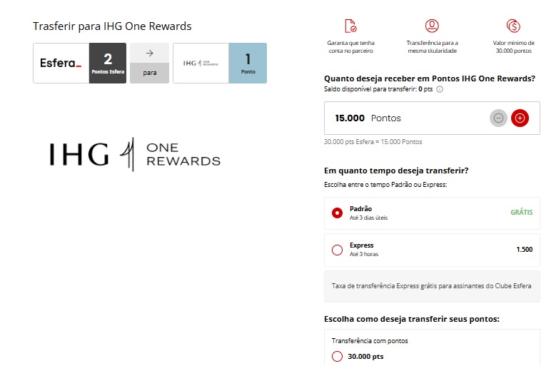 - Taxa de Conversão: A paridade é de 2 pontos Esfera = 1 ponto IHG One Rewards. Isso significa que, para cada 4.500 pontos Esfera, você receberá 1.000 pontos no IHG One Rewards.