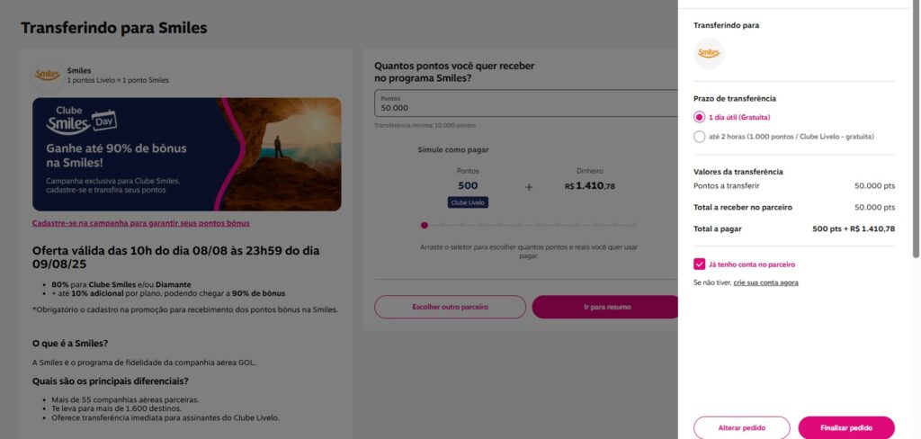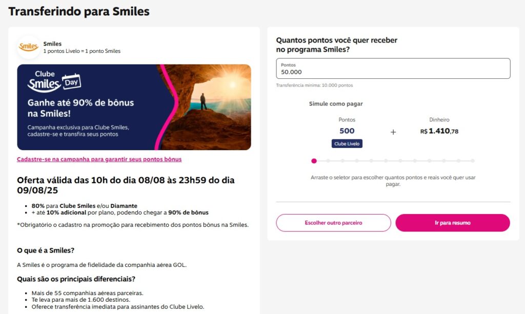 • Oferece transferência imediata para assinantes do Clube Livelo.