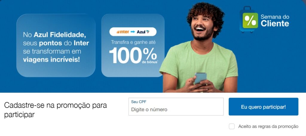 2. Para garantir o bônus, o cliente deve possuir cadastro no programa de fidelidade da Azul, com a conta em situação regular e cadastrar seu CPF no link da promoção https://www.voeazul.com.br/br/pt/ofertas/inter antes de realizar a transferência.
