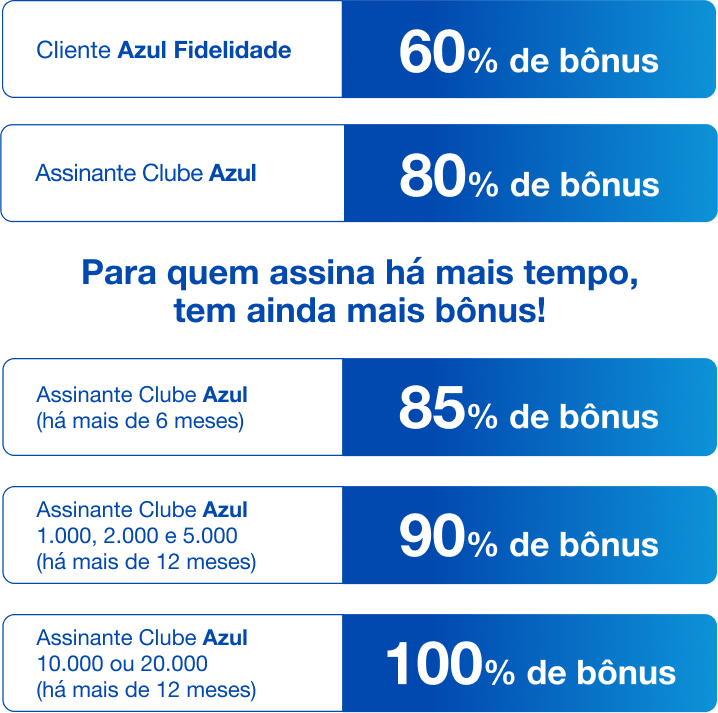 6.1. De acordo com a regras da Azul, assinantes Clube Azul 1.000, 2.000 e 5.000 ativos há pelo menos 12 meses recebem mais 10% de bônus juntamente com os pontos transferidos, cumulativos com promoções. O limite de bônus cumulativo é de 20.000 pontos por ano.