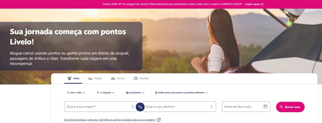 Por isso, para saber quantos pontos Livelo você vai precisar para alugar um carro, faça uma busca na nossa página de viagens. Selecione a cidade, o dia que precisa do aluguel do carro, o horário e a data de devolução, clique na lupa para fazer a consulta e veja a quantidade de pontos para resgatar o carro que deseja!