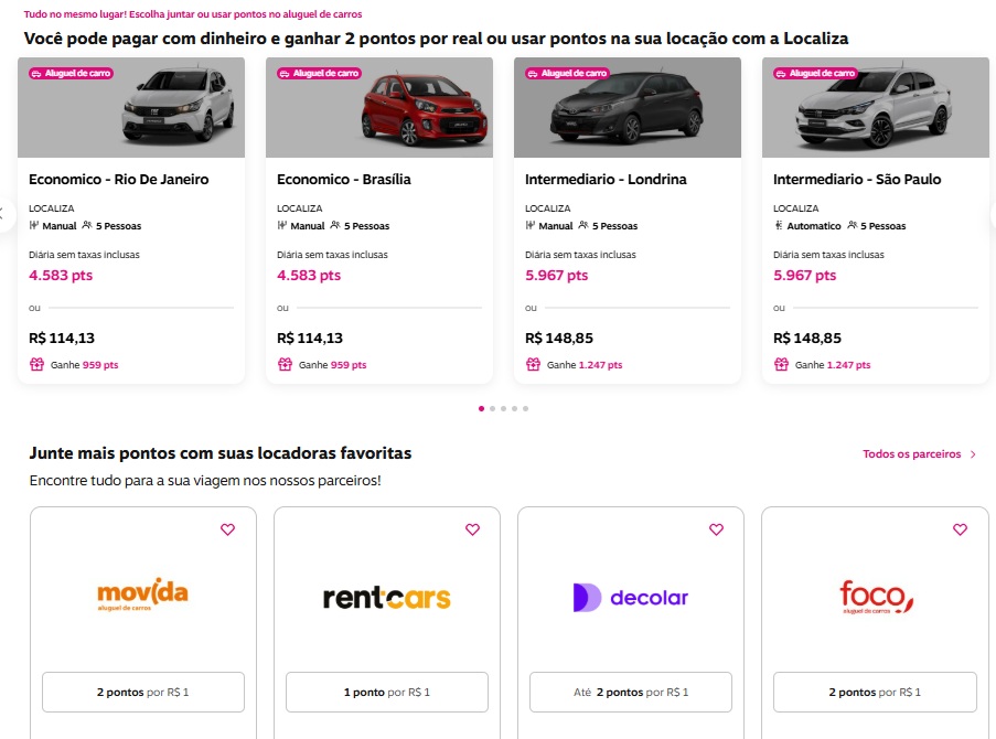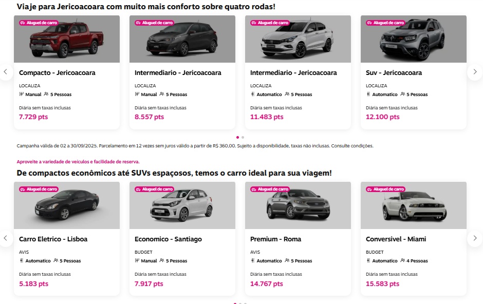 Isso varia de acordo com o destino e o modelo de carro escolhido para a sua viagem! As características do veículo também variam a quantidade de pontos, como por exemplo: se o automóvel possui direção hidráulica, ar condicionado ou é automático.