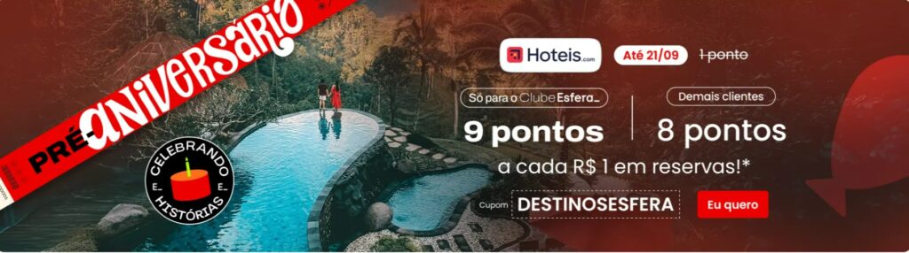 * Clientes Clube Esfera: 9 pontos a cada R$ 1,00 em reservas para Porto Seguro com checkout até 31/01/2026 (8 pontos a cada R$ 1,00 para demais clientes) com o uso do cupom DESTINOSESFERA