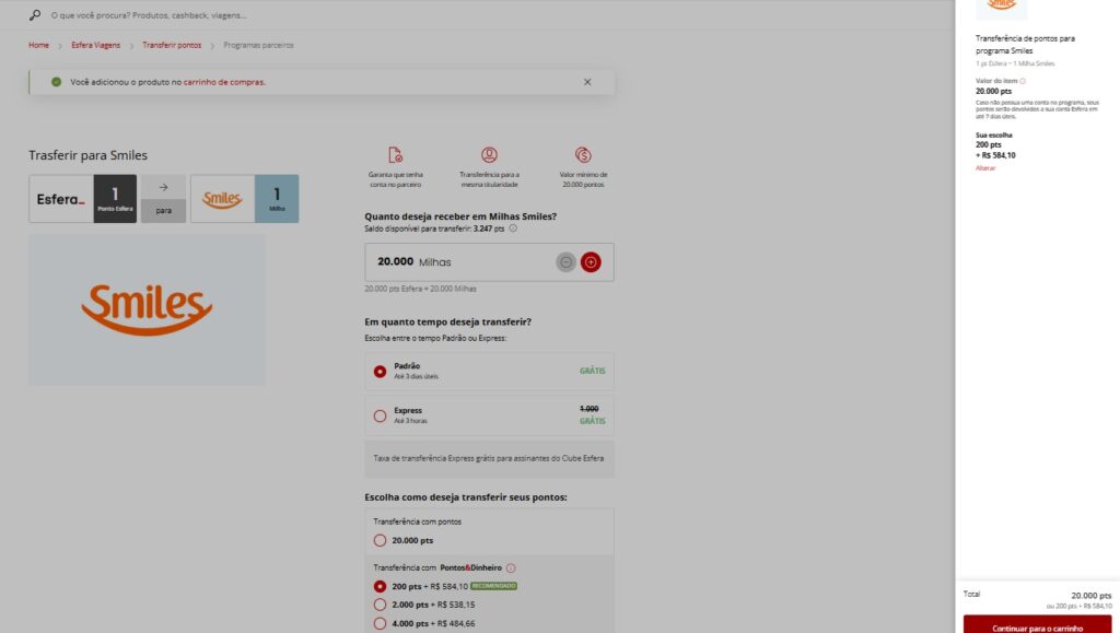 É possível fazer a transferência com um mínimo de 12.000 Pontos Esfera + Dinheiro. Para isso, é necessário adicionar um mínimo de 30.000 Pontos nesta página e, ao chegar na tela de carrinho, você escolherá a combinação de Pontos + Dinheiro a ser utilizada;