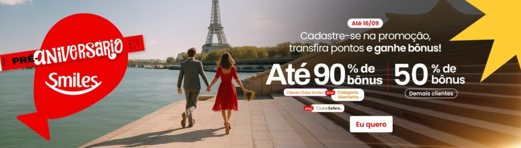 · Necessário possuir cadastro no programa de Fidelidade da Smiles, com a conta em situação regular e realizar cadastro do CPF na promoção através do link: www.smiles.com.br/portal/clube-smiles-day/bancos-esfera-ate-90-pc-bonus antes de realizar a transferência para garantir a bonificação.