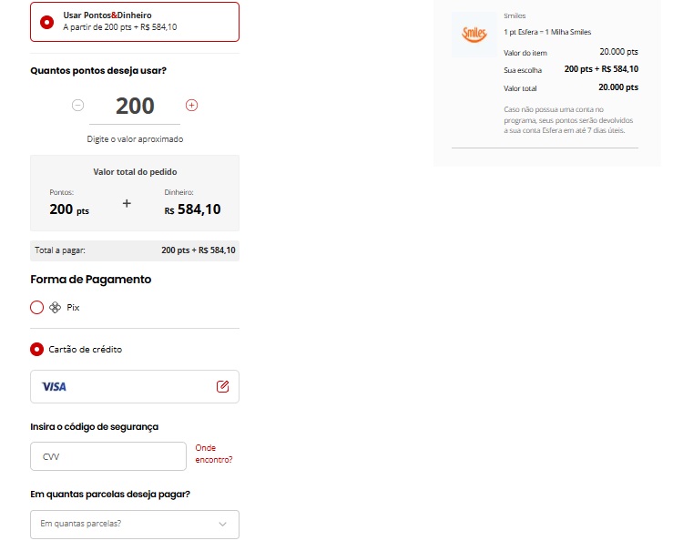 Quantidade mínima para a troca de pontos: 30.000 Pontos Esfera;