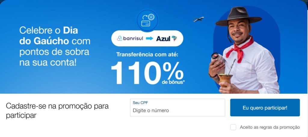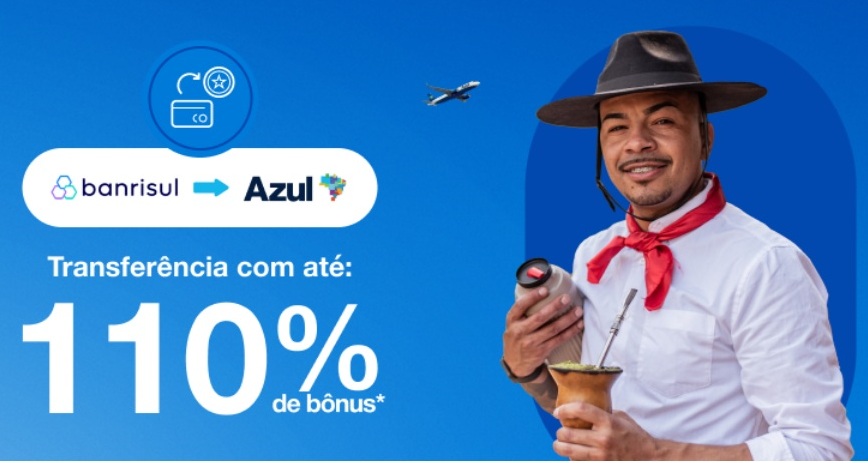 2. Para garantir o bônus, o cliente deve possuir cadastro no programa de fidelidade da Azul, com a conta em situação regular e cadastrar seu CPF no link da promoção https://www.voeazul.com.br/br/pt/ofertas/banrisul antes de realizar a transferência.