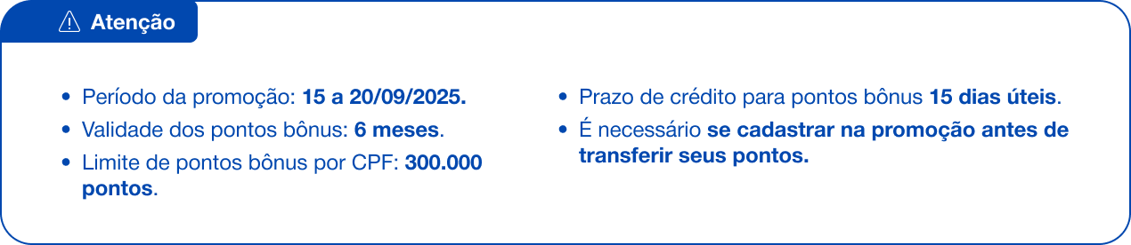 Após se cadastrar, transfira seus pontos até 20/09/2025.