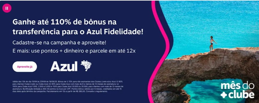 2. Para garantir o bônus, o cliente deve possuir cadastro no programa de fidelidade da Azul, com a conta em situação regular e cadastrar seu CPF no link da promoção https://www.voeazul.com.br/br/pt/ofertas/livelo antes de realizar a transferência.