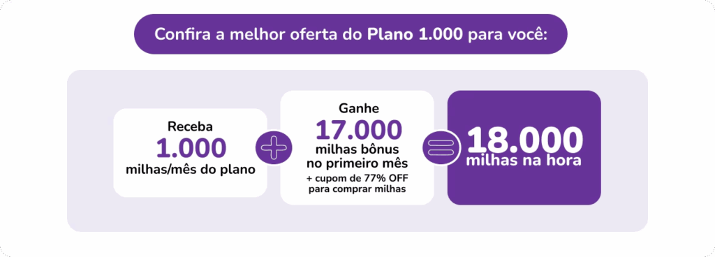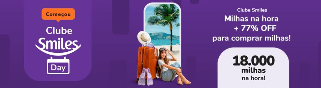 Assine o Plano 1.000 e receba 18.000 milhas na hora + cupons com 77% de desconto para comprar até 50.000 milhas. Não perca tempo e assine já para começar a aproveitar as ofertas exclusivas do Clube Smiles Day!