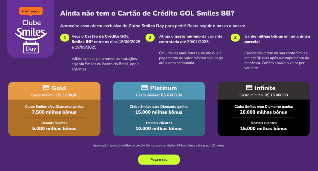 2) Peça o seu: Clube Smiles Day Válida para novos clientes, que contratarem o Cartão de Crédito GOL Smiles BB entre os dias 15/09/2025 e 19/09/2025.