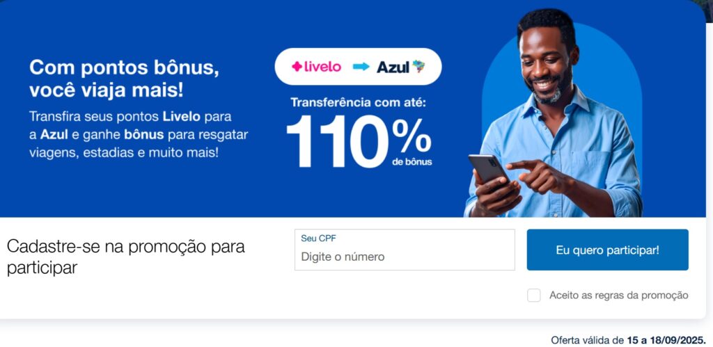Para os consumidores que buscam viajar com boas oportunidades, a ação da Livelo com a Azul Fidelidade é a oportunidade ideal. Até quinta-feira (18/09), para todos os clientes, a bonificação é de 70% ao transferir os pontos para a Azul Fidelidade. Já para os assinantes Clube Livelo ou Clube Azul Fidelidade, o bônus é de 95%.