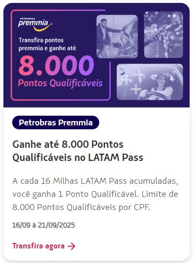 Transfira seus pontos Premmia para o LATAM Pass e ganhe até 8.000 Pontos Qualificáveis. A cada 16 Milhas LATAM Pass acumuladas, você recebe 1 ponto qualificável. Limite de até 8.000 Pontos Qualificáveis por CPF.