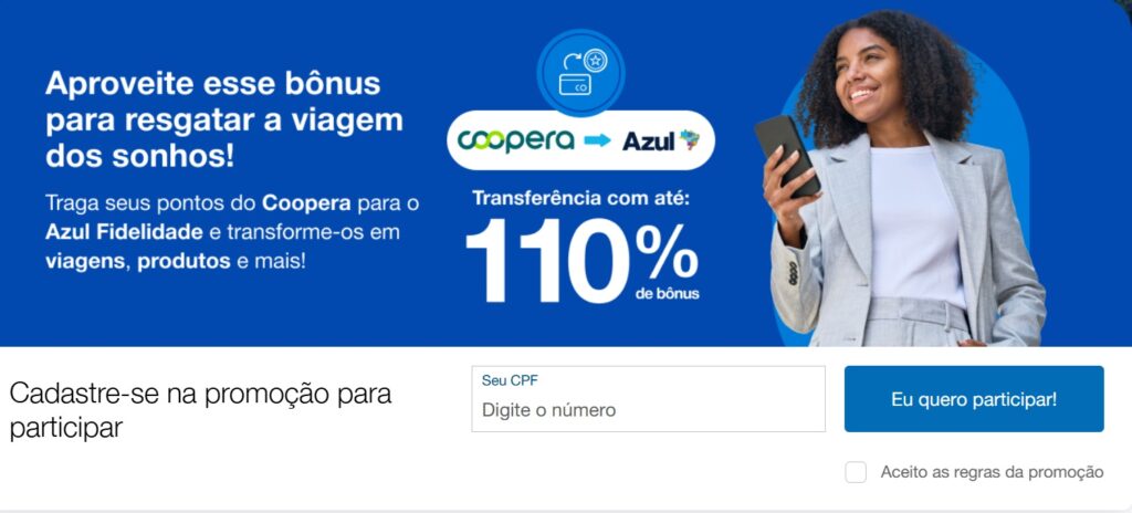 2. Para garantir o bônus, o cliente deve possuir cadastro no programa de fidelidade da Azul, com a conta em situação regular e cadastrar seu CPF no link da promoção https://www.voeazul.com.br/br/pt/ofertas/coopera antes de realizar a transferência.