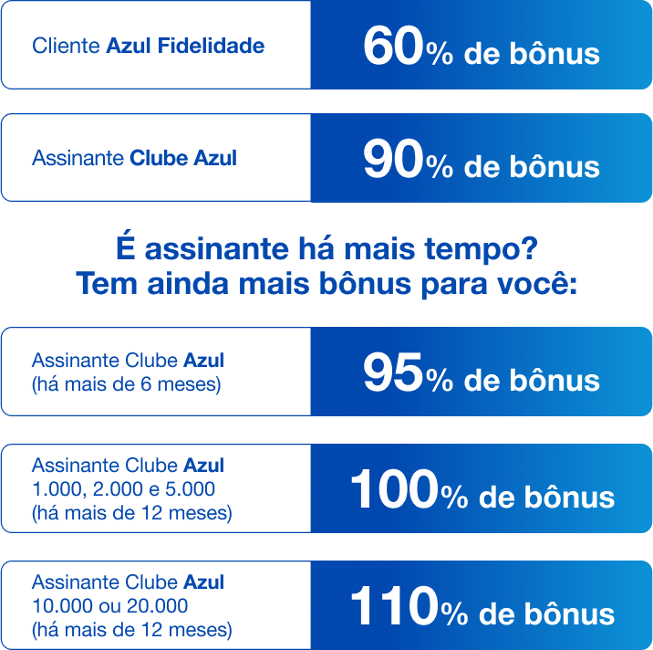 5. Para receber o bônus, o cliente deve se inscrever no Clube Azul, estar com o pagamento em dia, se inscrever na promoção, antes de realizar a transferência