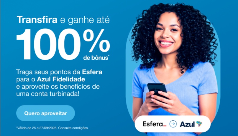 2. Para garantir o bônus, o cliente deve possuir cadastro no programa de fidelidade da Azul, com a conta em situação regular e cadastrar seu CPF no link da promoção https://www.voeazul.com.br/br/pt/ofertas/esfera antes de realizar a transferência.