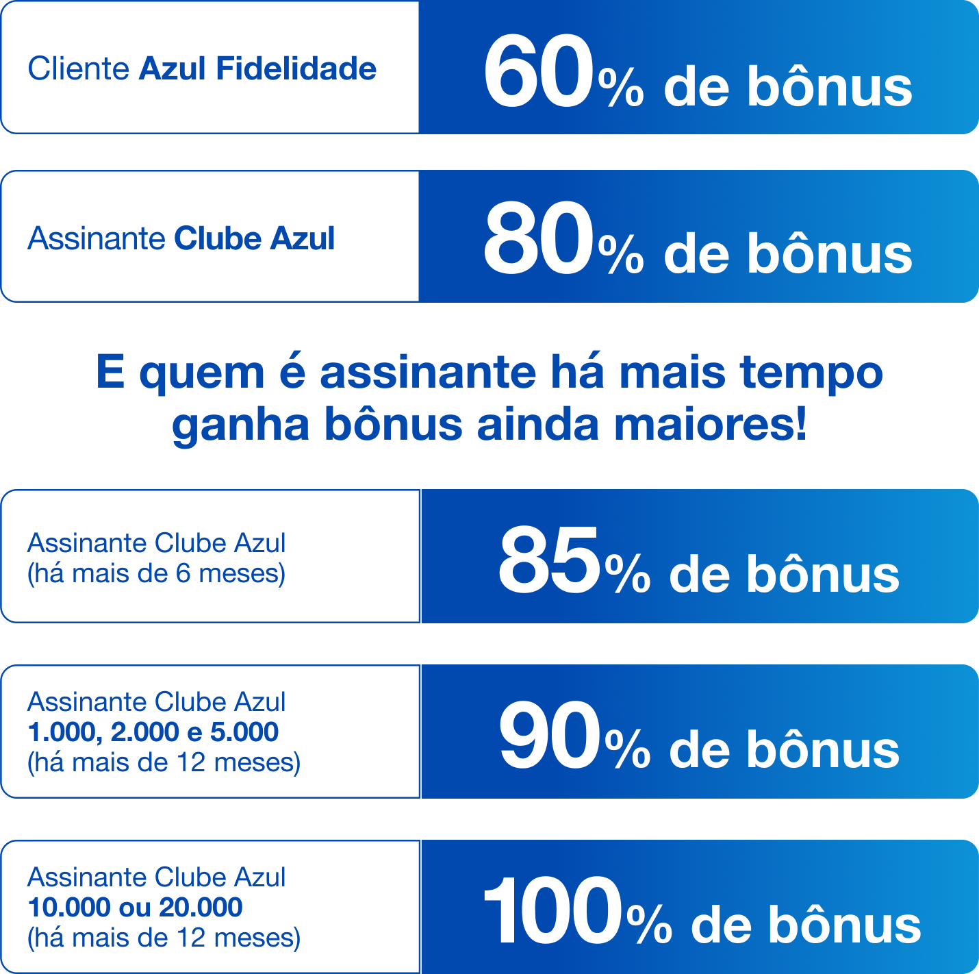 6.2. De acordo com as regras da Azul, assinantes do Clube Azul ativo plano 10.000 ou plano 20.000 há mais de 12 meses receberão mais 20% de bônus sobre os pontos transferidos. O limite de bônus cumulativo é de 20.000 pontos por ano.