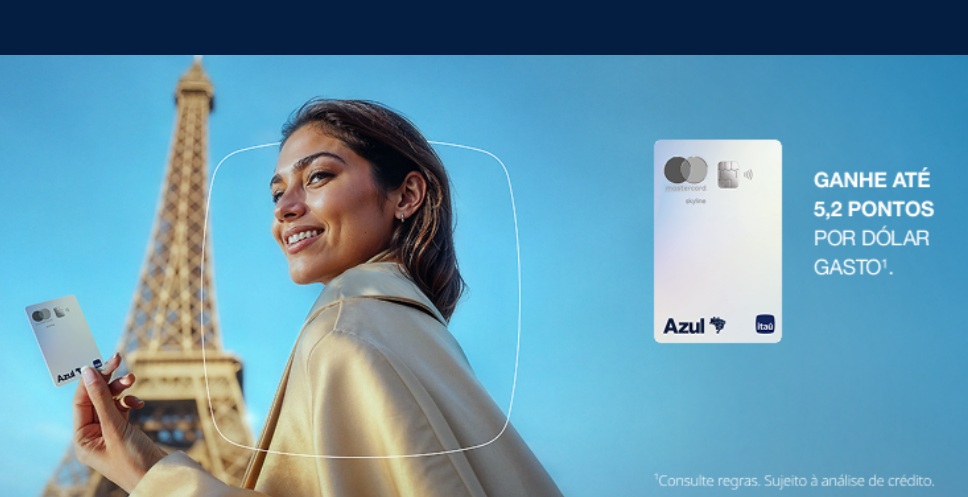 Cartão Azul Internacional: 2,1 pontos por dólar gasto em compras e 2,25 pontos por dólar gasto em compras realizadas na Azul.
