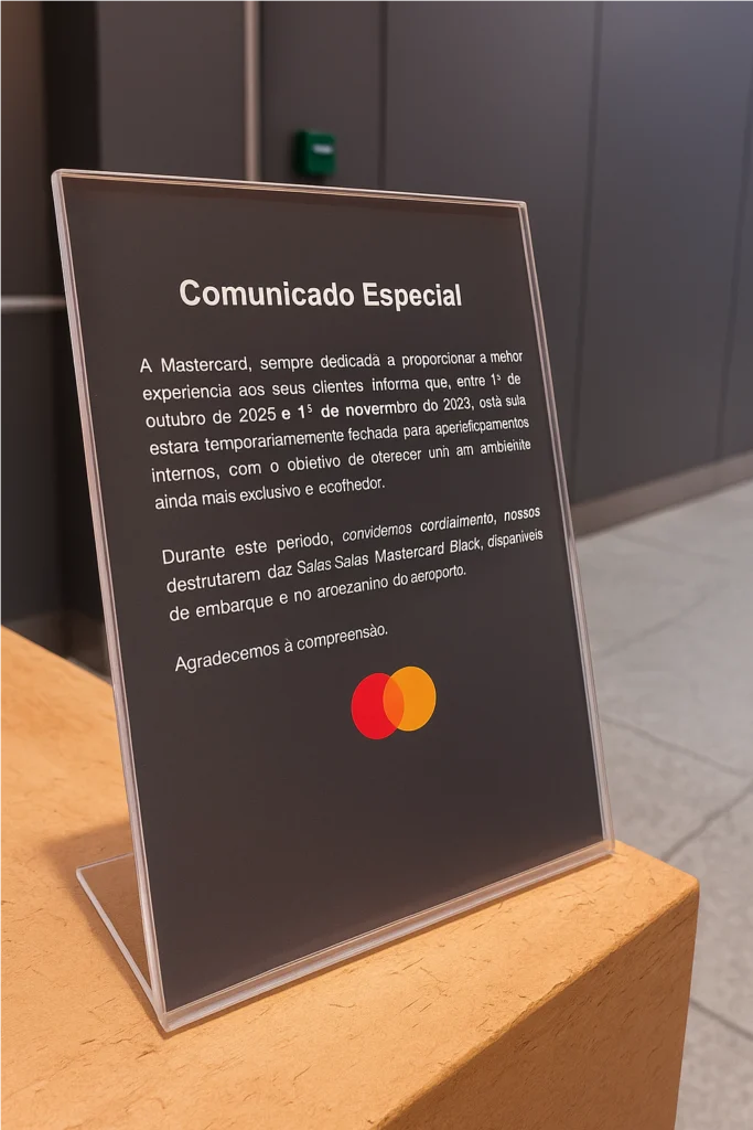 Segundo comunicado oficial exposto na entrada da sala, a intenção é oferecer um ambiente mais exclusivo e acolhedor aos clientes. Durante o período de obras, os portadores de cartões Mastercard Black poderão utilizar normalmente as demais salas da bandeira, disponíveis tanto no piso de embarque quanto no mezanino do aeroporto.
