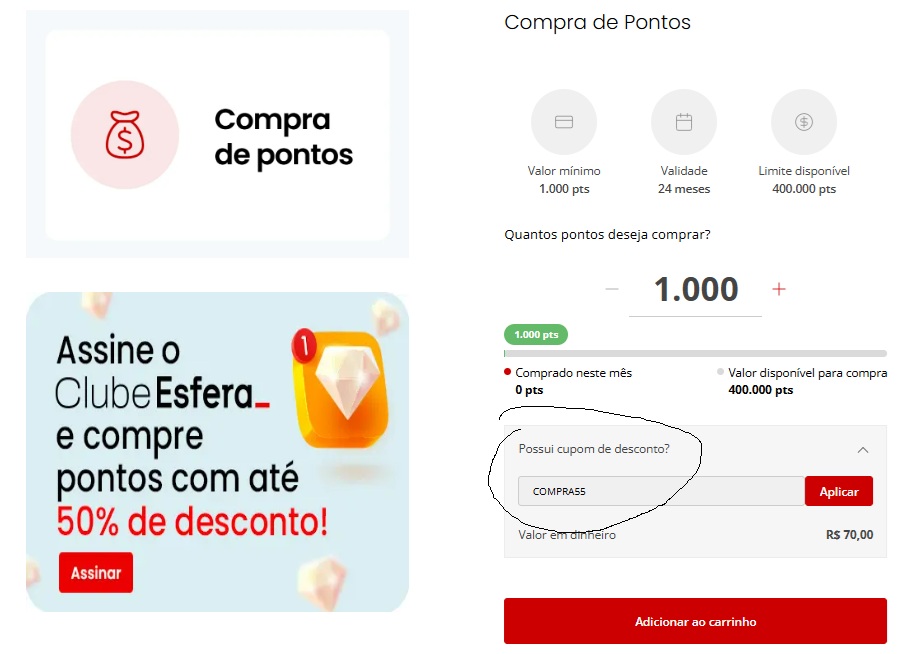 1 – A quantidade mínima para compra é de 1.000 pontos. Limite de 200.000 pontos ou cinco pedidos por mês, o que ocorrer primeiro. Para quem tem Clube Esfera, o limite é de cinco pedidos por mês e a quantidade varia conforme tabela abaixo.