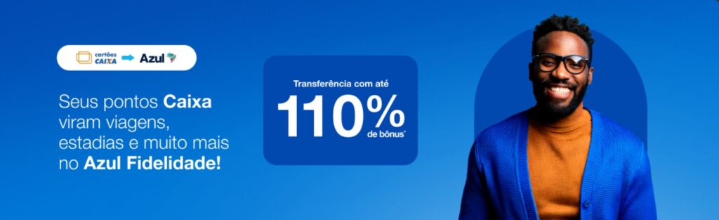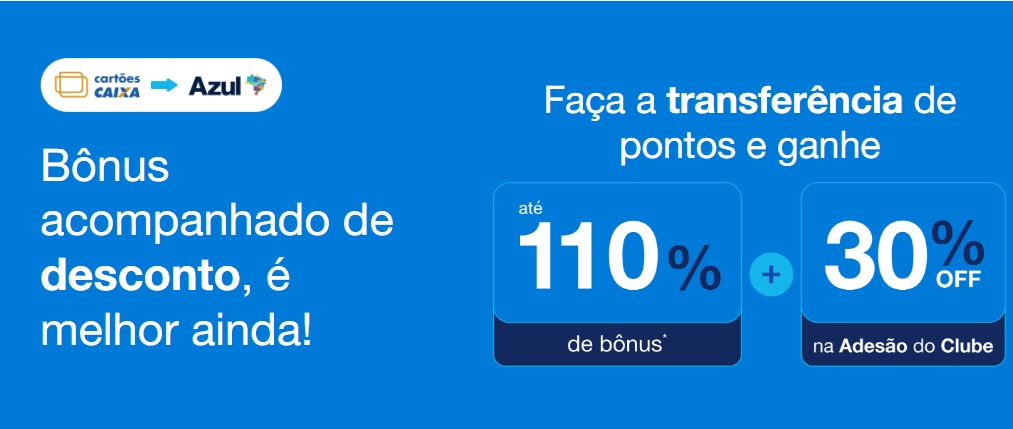 2. Para garantir o bônus, o cliente deve possuir cadastro no programa de fidelidade da Azul, com a conta em situação regular e cadastrar seu CPF no link da promoção https://www.voeazul.com.br/br/pt/ofertas/caixa antes de realizar a transferência.