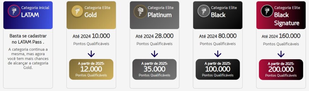 A partir de 2025, nossas categorias serão: Gold, Platinum, Black e Black Signature. Com a nova estrutura, os clientes se qualificarão exclusivamente pelo acúmulo de pontos Qualificáveis, eliminando a opção de qualificação por Trechos Qualificáveis.