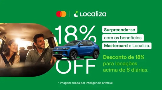 Surpreenda-se com os benefícios Mastercard e Localiza! Alugue com mais economia! Garanta 18% de desconto em locações acima de 6 diárias. Viaje com segurança e conforto o ano todo! Válido somente para reservas em território nacional.
