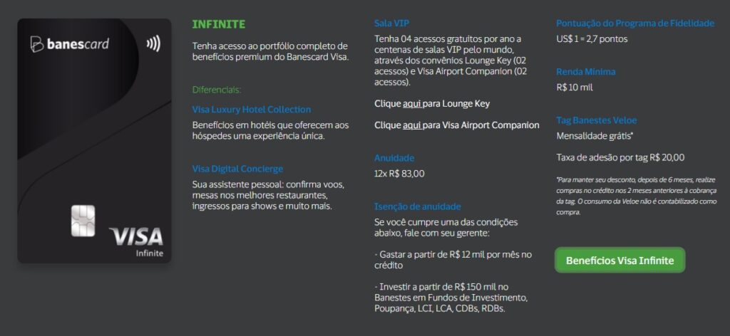 O Banescard Visa Infinite é o cartão de crédito de mais alto padrão do Banestes (Banco do Estado do Espírito Santo). Por ser um Visa Infinite, ele oferece uma suíte completa de benefícios de luxo, com foco em viagens e exclusividade.
