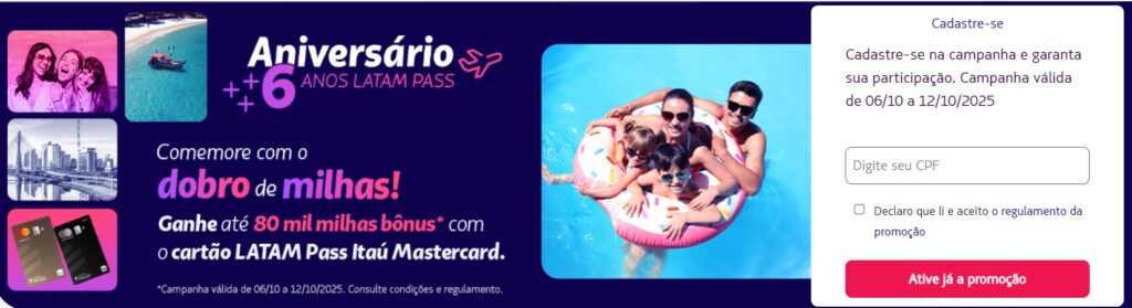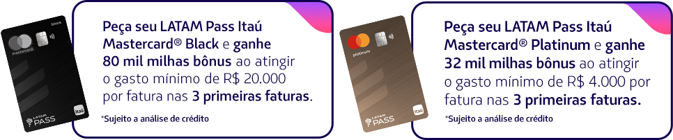 Esta Campanha é válida para Clientes LATAM Pass que (i) solicitarem o cartão LATAM Pass Itaú Mastercard Platinum ou LATAM Pass Itaú Mastercard Black, entre às 09h do dia 06 de outubro de 2025 até às 23h59 do dia 12 de outubro de 2025, horário oficial de Brasília (“Período da Campanha”), tiverem os respectivos cartões aprovados e emitidos pelo Banco Itaú até às 23h59, horário oficial de Brasília, do dia 25 de outubro de 2025, e (iii) atingirem a meta de gastos abaixo estipulada durante