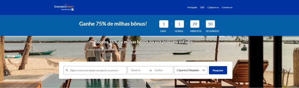 A Promoção: Como membro do ConnectMiles, ganhe 75% milhas bônus por estadia em suas reservas efetuadas por meio do ConnectMiles Hotels. Para participar desta promoção, a reserva do hotel deverá ser efetuada por meio do site: https://connectmileshotels.copaair.com/