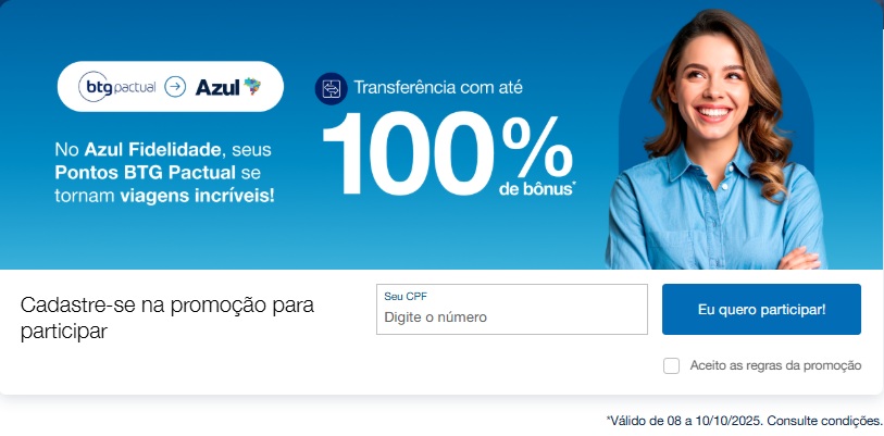 2. Para garantir o bônus, o cliente deve possuir cadastro no programa de fidelidade da Azul, com a conta em situação regular e cadastrar seu CPF no link da promoção https://www.voeazul.com.br/br/pt/ofertas/btg antes de realizar a transferência.