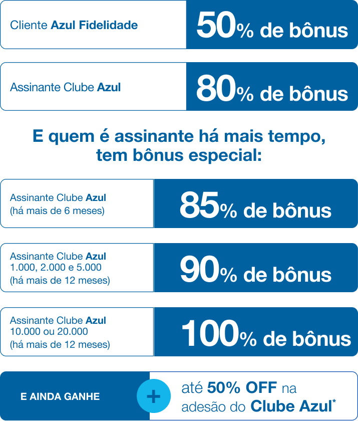 7.1. Bonificações para assinantes Clube Azul com adesão na data da transferência, poderão receber a bonificação pertinente ao produto em data diferente do restante do bônus.