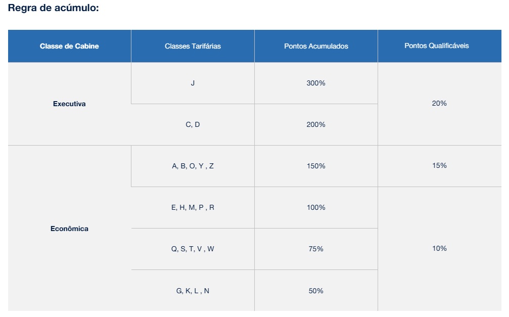 Exemplo: 800 milhas voadas na compra de uma passagem na classe J (300%), o cliente receberá um total de 2400 pontos no programa Azul Fidelidade.
