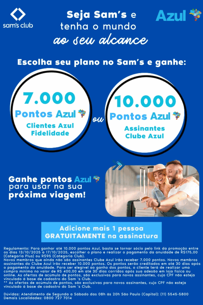 A oferta de até 10.000 pontos Azul é geralmente uma campanha promocional por tempo limitado para adesão à anuidade do Sam’s Club, e não uma regra fixa de acúmulo.