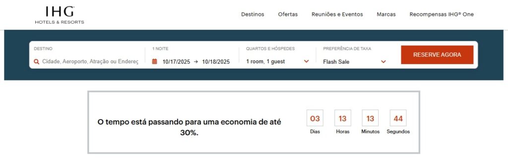 Oferta Promocional de Promoção Relâmpago do IHG Hotels & Resorts. Membros economizam até 30%. Não membros economizam até 25%. A “Tarifa Promocional” é válida em propriedades e marcas participantes nos EUA, Canadá, México, América Latina, Caribe, Grande China e Japão. A Tarifa Promocional de Promoção Relâmpago está disponível na Grande China e no Japão para reservas feitas entre 7 e 12 de outubro de 2025 e nos EUA, Canadá, México, América Latina e Caribe para reservas feitas entre 7 e 16 de outubro de 2025. A Tarifa Promocional de Promoção Relâmpago é válida para estadias entre 10 de outubro de 2025 e 28 de fevereiro de 2026 em todas as regiões participantes.