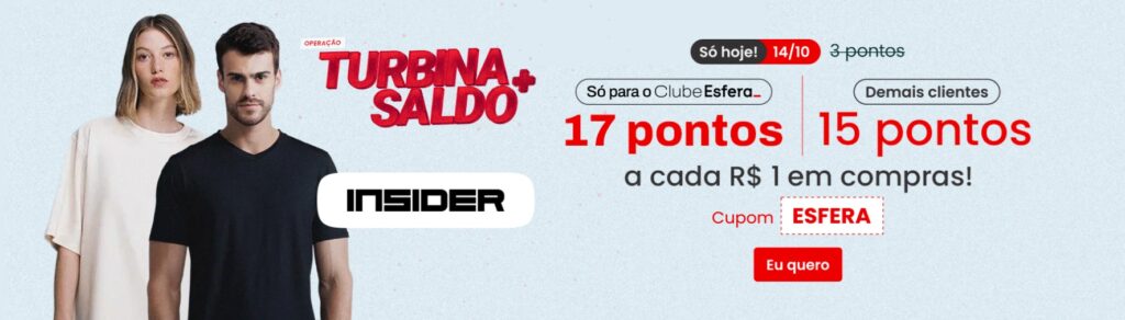 - Para juntar pontos, acesse o hotsite através do botão “Ver Cupom” e depois “Ir para o site do parceiro”, insira o cupom ESFERA, escolha seus produtos e utilize as opções de pagamentos disponíveis no site.
