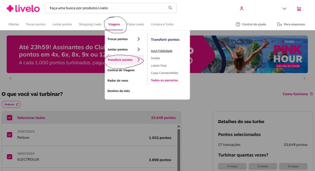 1º Click em viagens, em seguida Transferir pontos, click Azul Fidelidade