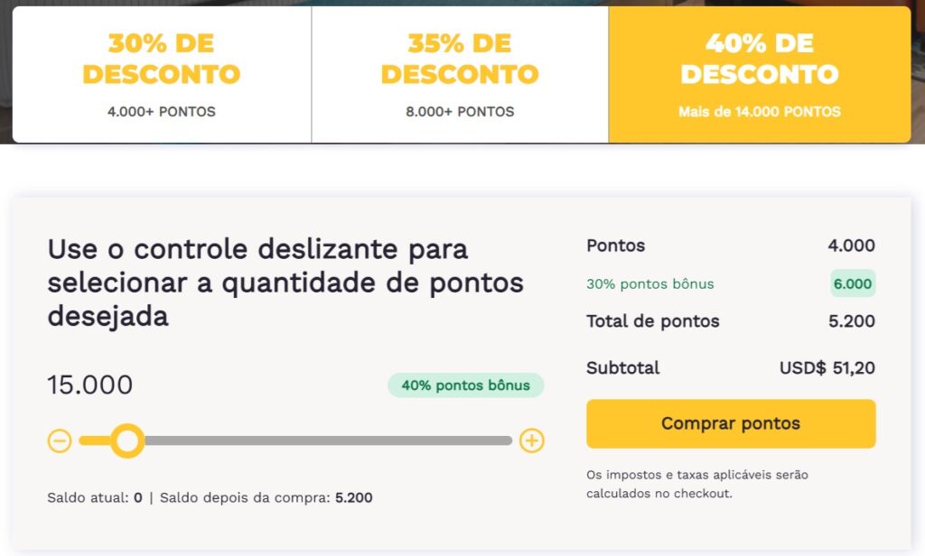 As transações devem ser concluídas entre 00:00 EST de 2 de outubro de 2025 e 23:59 EST de 10 de novembro de 2025 para serem elegíveis para esta oferta de bônus de até 40%. Para compras de pontos entre 4.000 e 7.000, receba um bônus de 30%, para compras de pontos entre 8.000 e 13.000, receba um bônus de 35% e para compras de pontos de 14.000 ou mais, receba um bônus de 40%.