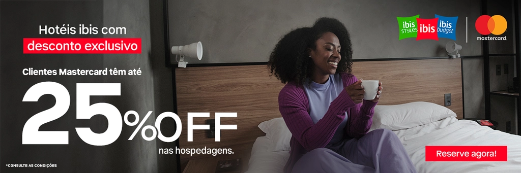 Ser cliente Mastercard é aproveitar diversos benefícios. Agora, você também garante até 15% OFF nos IBIS, para hospedagens até 31/12/25! Cadastre-se no programa de fidelidade dos hotéis Accor e obtenha mais 10% de desconto, totalizando 25% ao final de sua reserva. Essa tarifa é válida para reservas feitas com pelo menos 7 dias de antecedência da data de hospedagem. Oferta sujeita às condições de venda e disponibilidade do hotel selecionado.