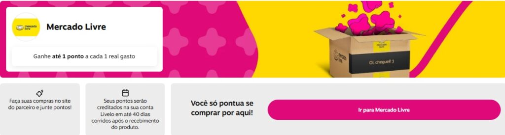 Ganhe 1 ponto Livelo a cada 1 real gasto em produtos no Mercado Livre, exceto supermercado e bebidas. A quantidade de pontos será correspondente ao valor efetivamente pago pelo produto. Consulte o regulamento na página do Mercado Livre no site da Livelo. A pontuação somente será contabilizada para compras realizadas através do link contido no perfil do Mercado Livre no site da Livelo