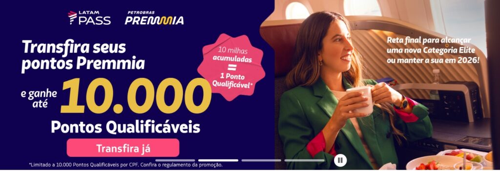 Transfira seus pontos Premmia para o LATAM Pass e ganhe até 10.000 Pontos Qualificáveis.