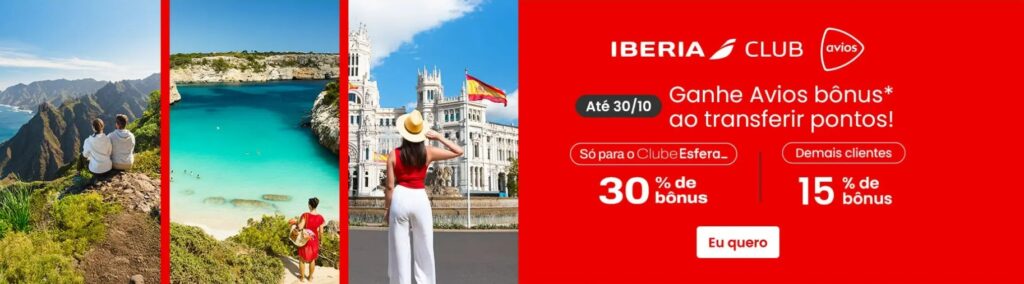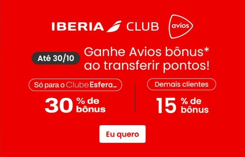 • Clientes com Clube Esfera receberão 15% (quinze por cento) de pontos Avios Bônus adicionais sobre o valor creditado na conta Iberia Club;