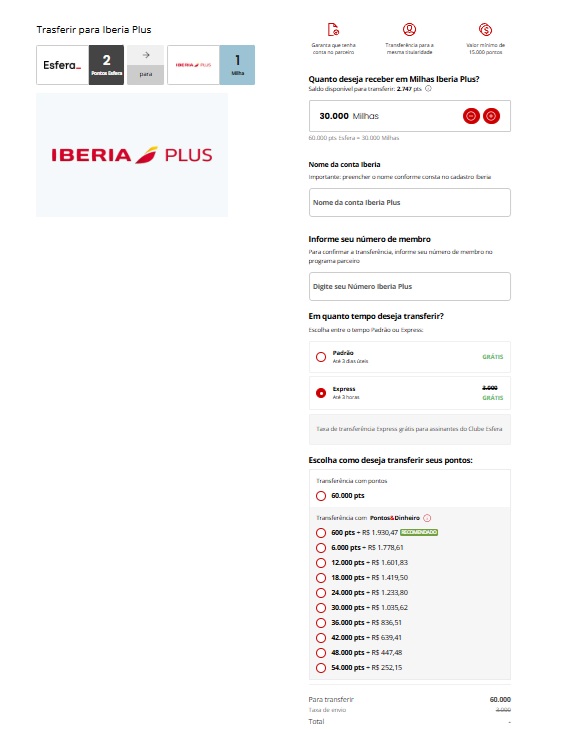 Veja este exemplo: 60.000 mil milhas Esfera = 30.000 mil milhas Ibéria Plus + 30% = 39.000 mil milhas total na conta da Ibéria ao valor R$ 1.930,47 / 39.000 = R$ 49,49 o milheiro. não estamos levando em consideração 600 pontos Esfera que já estava na conta de forma orgânica.