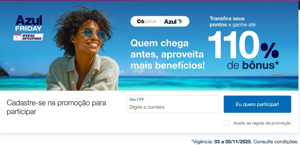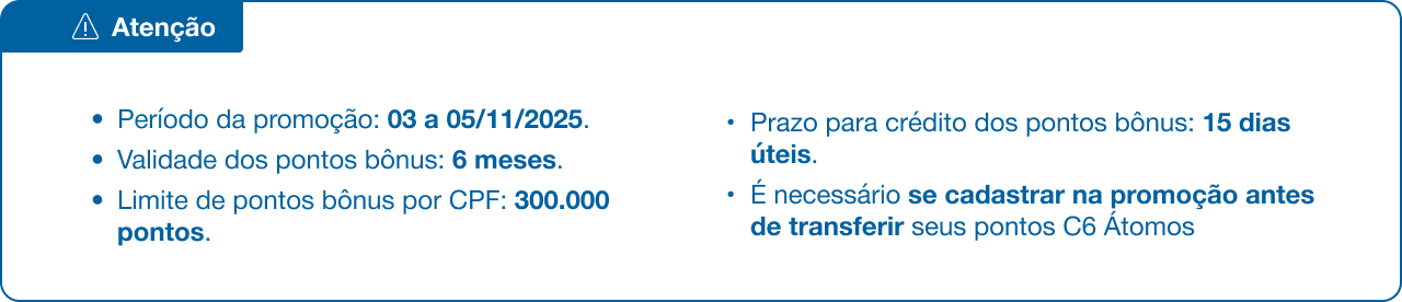Após se cadastrar, transfira seus pontos C6 Átomos até 05/11/2025.