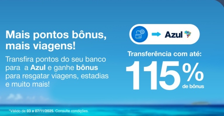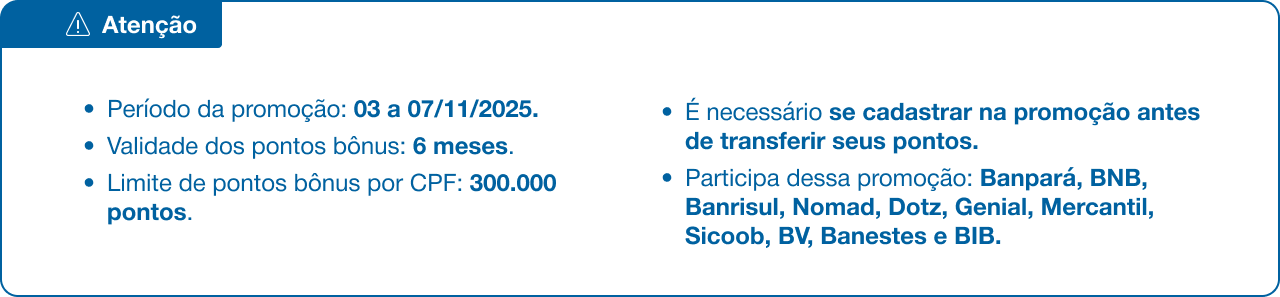 3.Clientes Azul: Bônus de 75% válido para clientes que transferirem pontos para o programa de fidelidade da Azul durante o período promocional. O limite máximo de pontos bônus a ser concedido por CPF é de 300.000 pontos. A bonificação será disponibilizada se o aceite da campanha for feito antes da transferência dos pontos.