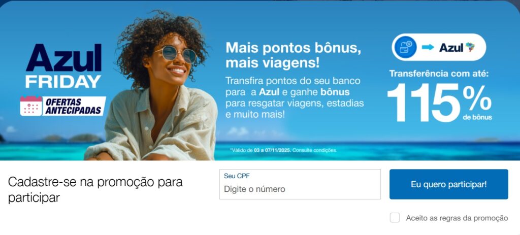 4. Clientes assinantes Clube Azul: Bônus de 95% válido para clientes assinantes do Clube Azul, com conta ativa, que transferirem pontos para o programa de fidelidade da Azul durante o período promocional. Para garantir o bônus de 95% o cliente deve realizar a adesão ao Clube Azul antes da transferência de pontos. O limite máximo de pontos bônus a ser concedido por CPF é de 300.000 pontos. A bonificação será disponibilizada se o aceite da campanha for feito antes da transferência dos pontos.