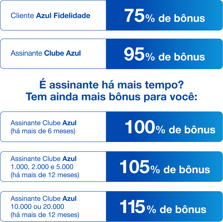 6.1. De acordo com a regras da Azul, assinantes Clube Azul 1.000, 2.000 e 5.000 ativos há pelo menos 12 meses recebem mais 10% de bônus juntamente com os pontos transferidos, cumulativos com promoções. O limite de bônus cumulativo é de 20.000 pontos por ano.
