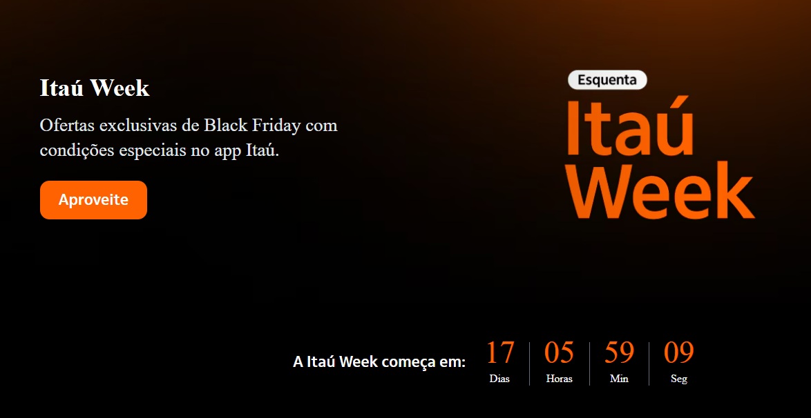 Esquenta da campanha antecipa a semana da Black Friday, que ocorre de 24 a 30 de novembro, com descontos de até 70% no Itaú Shop